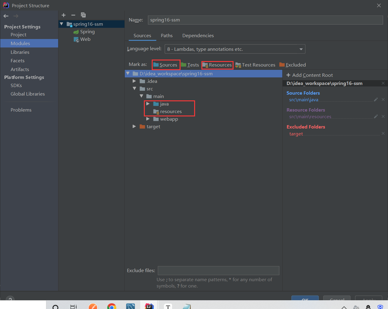 2、在file---->project structre---->modules中找到你所建的项目,在源文件的main目录下新建java包和resources(用于存放jdbc连接语句)的文件并更改其属性
