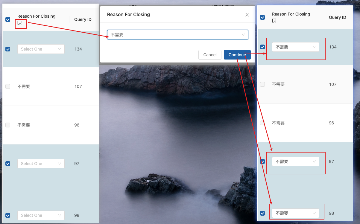 总结: 数据的改变始终是在初始化数据的基础上进行改变,不论是批量改变还是单个改变,都应该统一改变一个字段(如果初始数据上没有,可以自己添加),如果只考虑改变了哪些数据,有些局限性,比如在这个场景中,在事件中我只能拿到guid和reason,但是后端还需要sfv_guid,我是没有办法拿到的。
