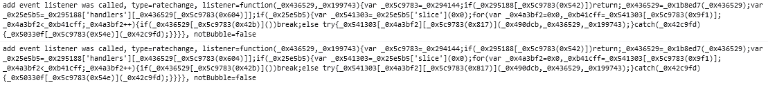 document.querySelector("video").playbackRate = 2;是无效的,他会马上给你改回来(题外话,发现如果把倍速设置为1以下,就不会被拦截,这是什么恶趣味?)。常规的话,想要移除绑定了回调函数的监听器,只能移除有名字的函数的监听器,移除匿名函数的监听器是不可能的。此外,某星还对其部分js源码进行了加密,比如video.js,放眼望去几万行代码,各种混淆后的标识符名字,我截取一行你们体会下function a0_0x3ffc(_0xf3628b,_0x19b3a9){var _0x53fe0f=a0_0x53fe();return a0_0x3ffc=function(_0x3ffc55,_0x4f6c6f){_0x3ffc55=_0x3ffc55-0xfd;var _0x1795ee= - 首先,利用新版的Chrome浏览器,可以移除绑定匿名函数的事件监听器!怎么样是不是很意外?我也很意外,但就是这样,不得不说Chrome太强大了,也是最近一两年才推出的这个操作(题外话:新版的Chrome浏览器也终于汉化了控制台,算是解决了一大历史遗留问题,是我们的福音啊。我现在虽然还是以使用Firefox浏览器为主,但能明显地感受到,Chrome比Firefox的手感实在是丝滑太多了,比如打开调试器的时候,我的Firefox比Chrome总是更容易卡死,又比如在调试器搜索东西的时候,搜索出来的结果也经常是Chrome更多。强大的Chrome甚至比Firefox还多了一个getEventlisteners的函数。感觉Firefox在走下坡路啊,悲伤ing,Firefox你要振作起来啊)。虽然利用新版的Chrome浏览器,可以移除事件监听器,但这有个问题,操作太麻烦,每次都要手动打开控制台,找到iframe里面的video,然后找到ratechenge事件,然后手动移除之。这个操作是不能用js完成的,没有自动化就没有灵魂啊!不能满足我的需求,我要继续折腾,而且我要找到一种能够在Firefox上使用的方法。转变思路:不再尝试移除匿名的Eventlistener