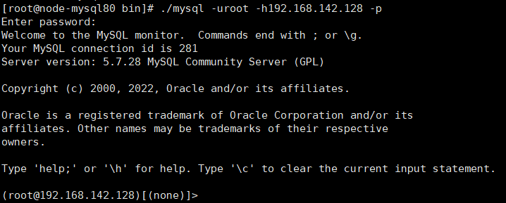 - [root@node-mysql80 bin]# ./mysql -uroot -h192.168.142.128 -p --用IP地址连接