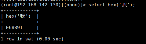 - (root@192.168.142.130)[(none)]> select hex('我');