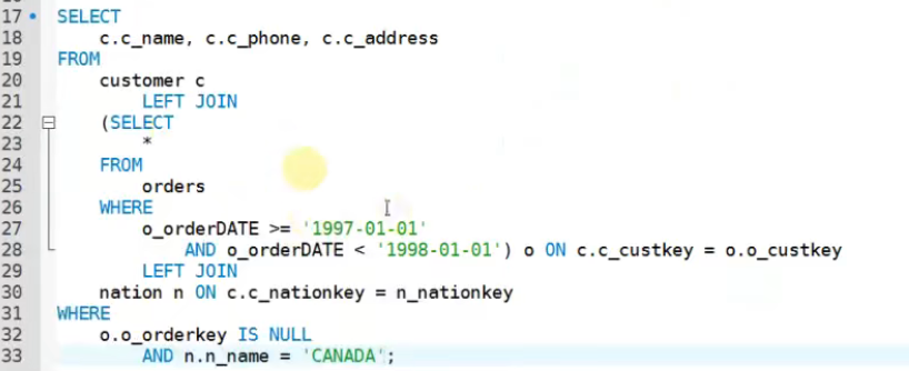 7、在dbt3数据库,客户是加拿大,在1997年没有产生订单的客户,怎么写sql?