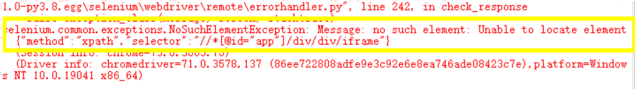 但是,我通过上面几种方式定位后,还是一直报找不到元素的错误提示😓,在百度上查找相关文章进行原因分析但是找到的基本都是上述的方法,因为我尝试过使用xpath的方法只要去除掉路径中最后的iframe就可以定位成功(iframe=driver.find_element_by_xpath('//*[@id="app"]/div/div/'),这种是成功的),但是加上iframe就不能成功(iframe=driver.find_element_by_xpath('//*[@id="app"]/div/div/iframe'),这种是不成功),所以我可以确定我的定位语句是正确的,但是就是找不到原因😔,经过我不懈努力无数次尝试和分析,最终还是被我找到了原因也是初学者容易忽视的原因。原因如下: