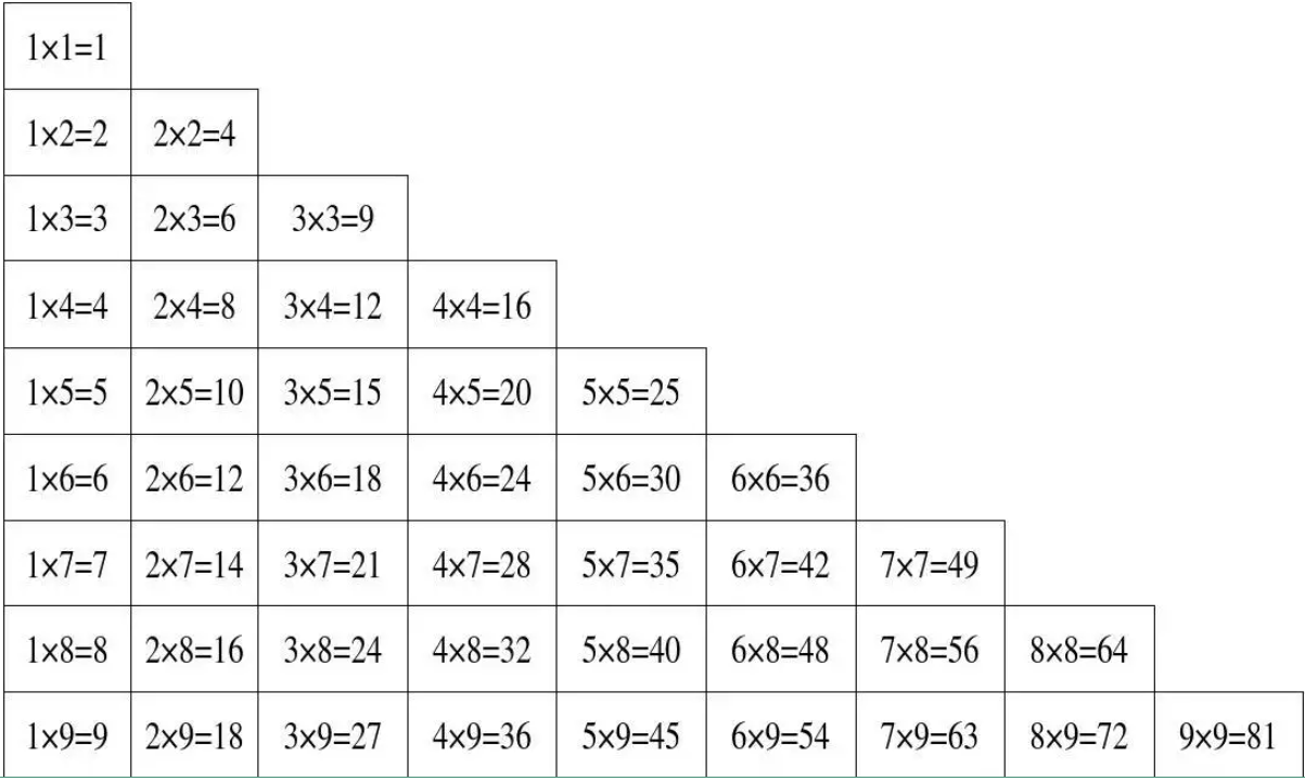 首先,我们来观察一下九九乘法口诀表: