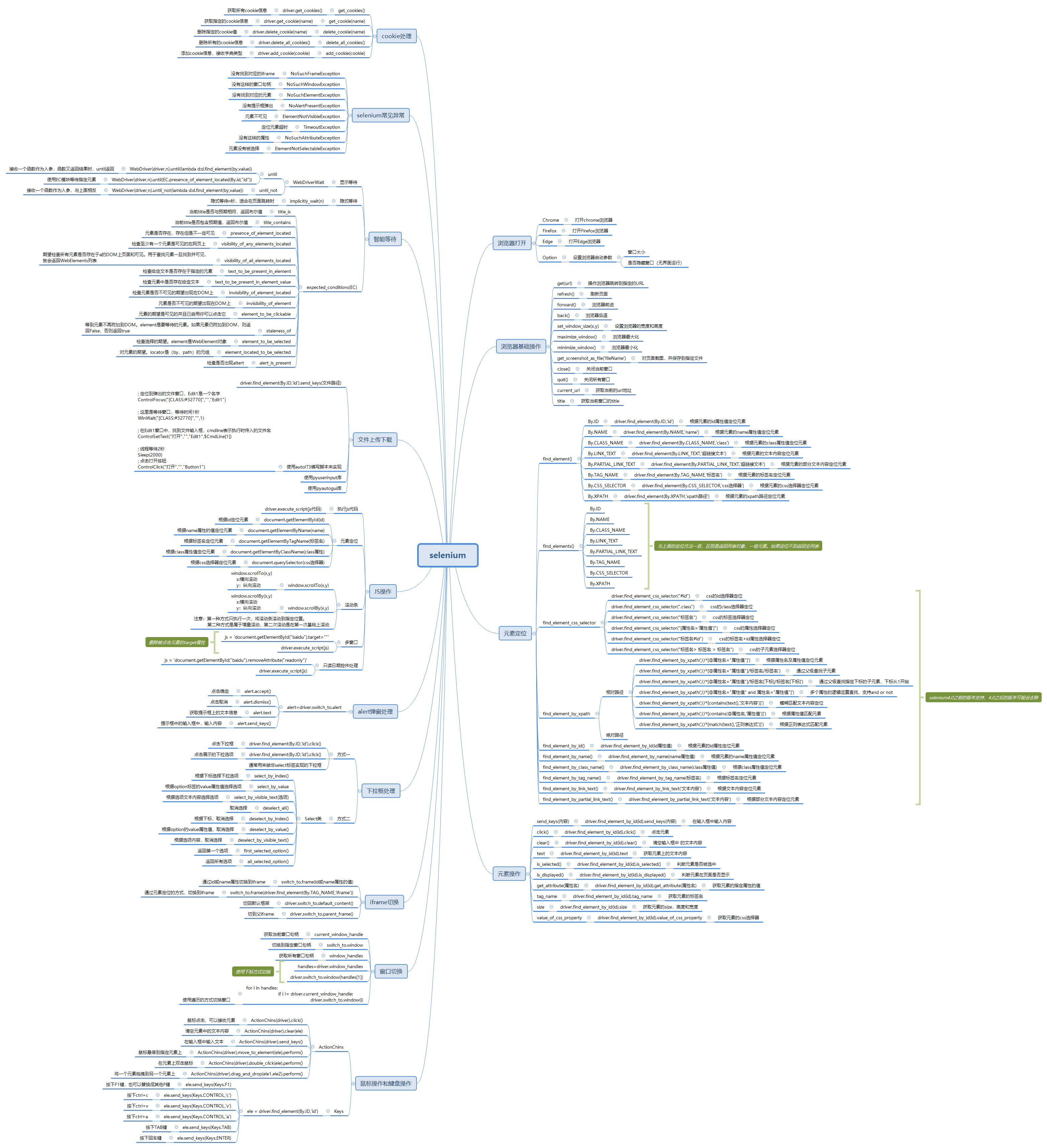 整个selenium的知识内容包含了浏览器的基本操作、元素定位、元素操作、Cookie管理、selenium常见的异常类型、智能等待、文件上传、js操作、提示框处理、下拉框的处理、窗口的切换、鼠标操作等。