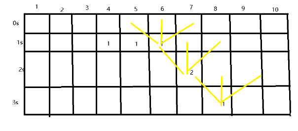 //因为每个点在每秒有三种可能走的情况,所以要记录下走到某点时拿到馅饼数的最大值。每次dp[i][j]都会在本身的基础上加上dp[i+1][j+1],dp[i+1][j],dp[i+1][j-1]这三者的最大值 } } } System.out.println(dp[0][5]); // for (int i = 0; i <= max; i++) { // for (int j = 0; j < 11; j++) { // System.out.print(dp[i][j]+" "); // } // System.out.println(); // } n=sc.nextInt(); } } private static int Max(int i, int i1) { int max=i; if(i1>i) max=i1; return max; } private static int Max(int i, int i1, int i2) { int max=i; if(i1>i) max=i1; if(i2>max) max=i2; return max; } }