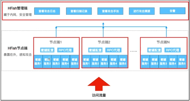 HFish采用B/S架构,系统由管理端和节点端组成,管理端用来生成和管理节点端,并接收、分析和展示节点端回传的数据,节点端接受管理端的控制并负责构建蜜罐服务。