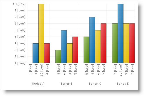 我们生成的ColumnChart,正常情况下X轴上既包括所绑定数值列名称,又包括Series的名称。而相同的数据,在Excel图表中所生成图表,X轴上通常只会显示Series的名称,并不包含所绑定数值列名称。这种情况下,我们要得到后者那样的效果,可通过以下代码方便的控制实现:
