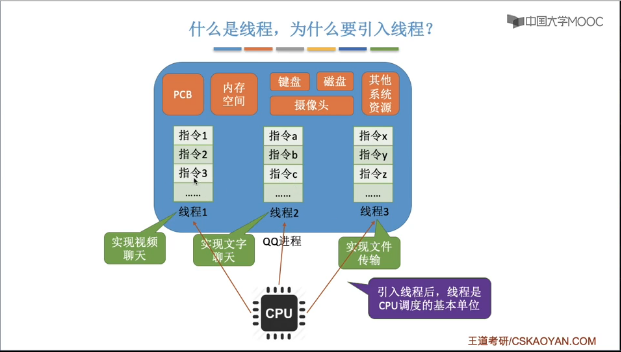 在一个进程当中包含若干个线程,这些线程共享这个进程当中的资源,是程序执行的最小单位。每个线程执行一段指令,实现特定功能。
