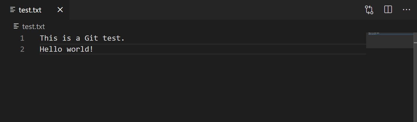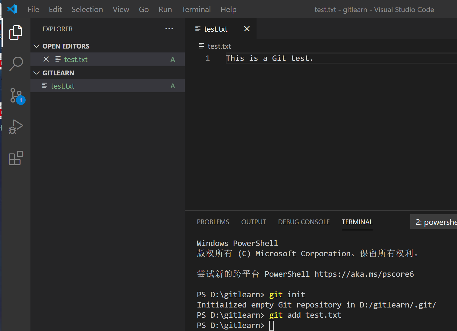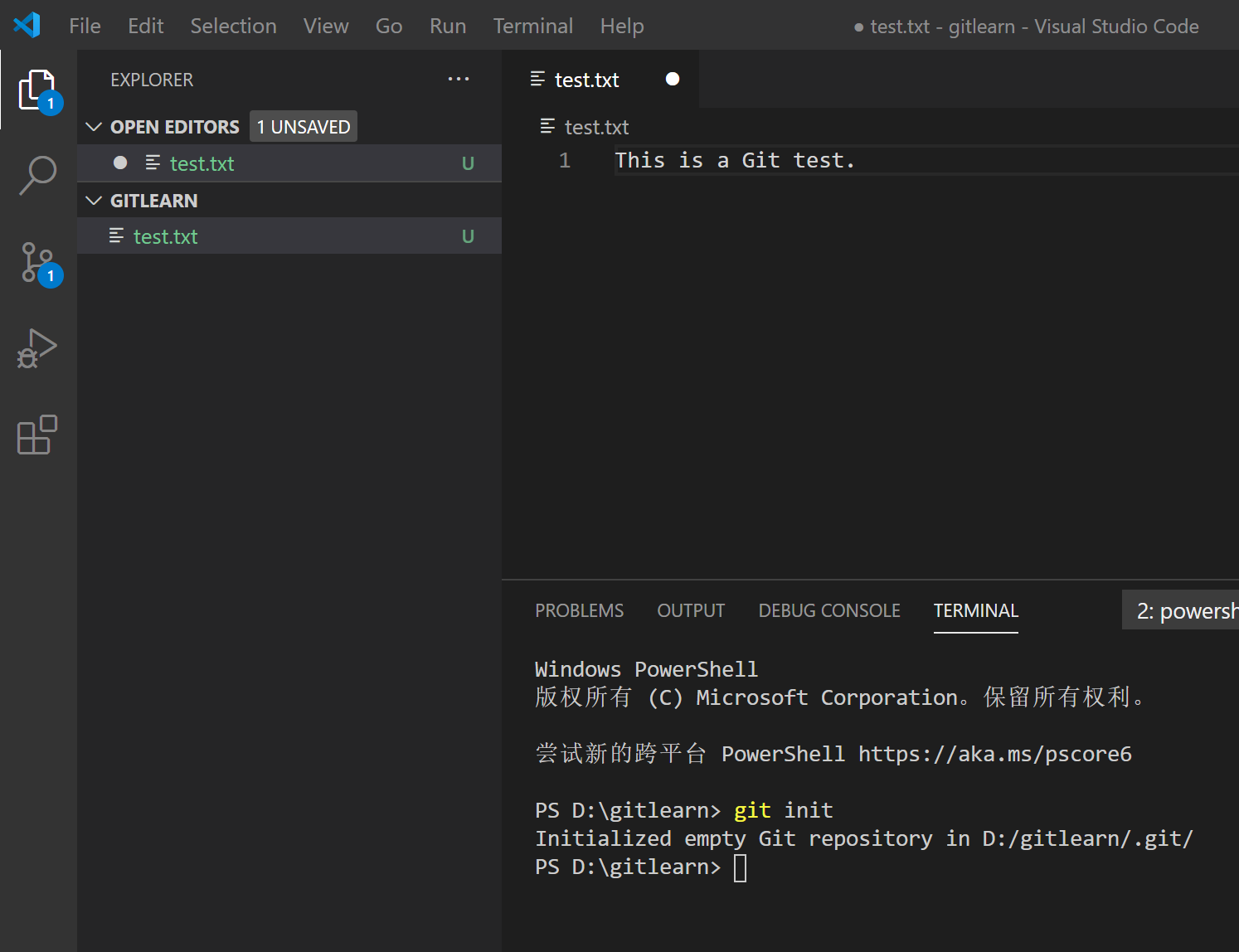 点击explorer(Ctrl+Shift+E),点击New File,创建一个名为test的txt文本文件,键入内容This is a Git test。此时该文件的状态为(绿色)U,绿色标记”U”表示该文件未添加到版本库进行跟踪(Untracked files)