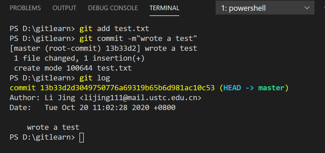 git commit -m"wrote a commit log info"//将test文本文件提交到仓库(repository)下,-m后面输入的是本次提交的说明,