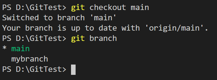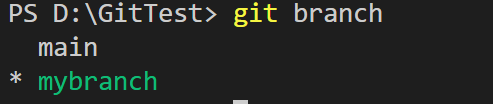 通过git branch查看有哪些分支,发现是这里是名为main的分支,且当前分支是mybranch分支(前面标有*)