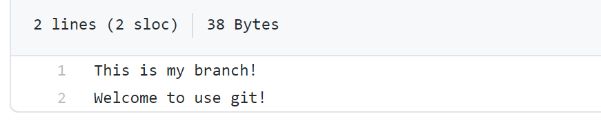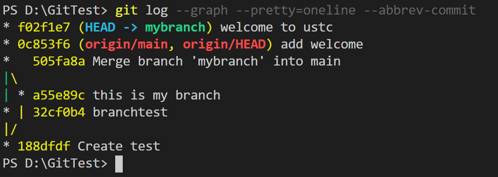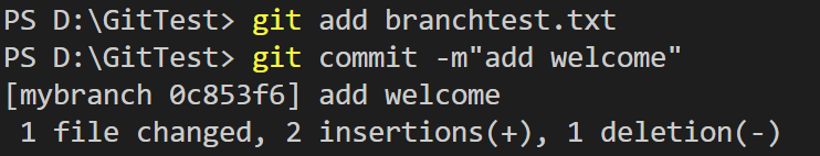 切换回mybranch分支,在该分支上完成一些操作,这里我创建了一个branchtest的文本文件,键入Welcome to use git!在终端实现以下命令