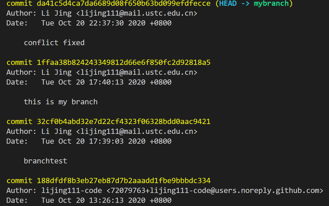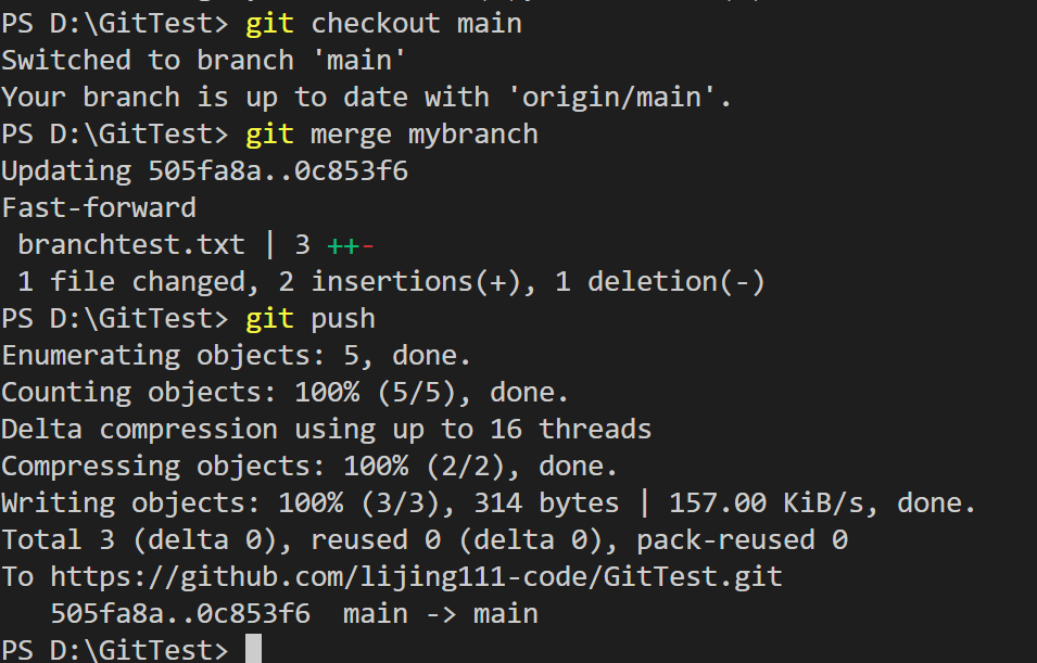最后,先切换回main分支,将远程origin同步最新到本地存储库,再合并mybranch到master分支,推送到远程origin/master之后即完成了一项开发工作。代码如下: