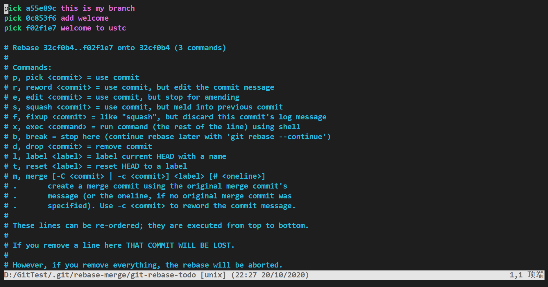 发现提交历史比较乱,那怎么可以让它成为一条干净的直线呢,这里就用到了git rebase命令,之后会打开命令行文本编辑器大致如下:如下代码演示: