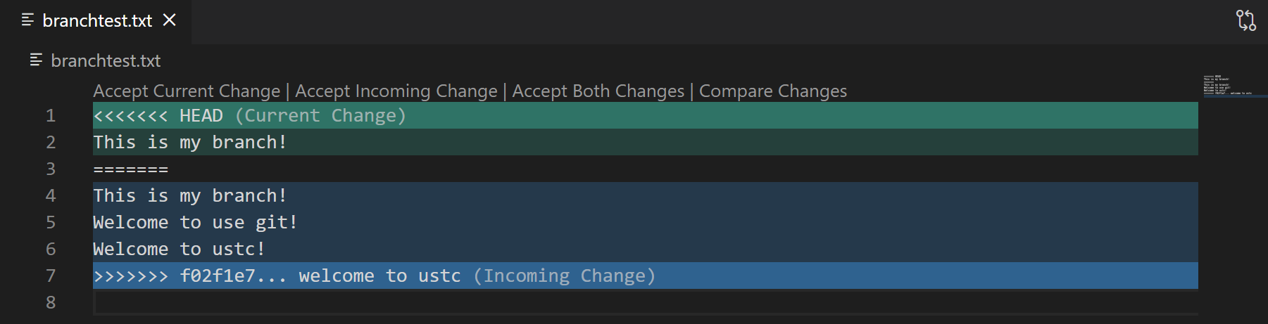 可以根据提示选择保留哪个更改,也可以直接编辑文件去掉提示信息。