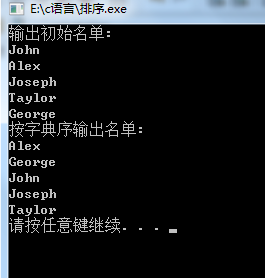 // 练习:使用选择法对字符串按字典序排序 #include <stdio.h> #include <string.h> #include <stdlib.h> void selectSort(char str[][20], int n ); // 函数声明,形参str是二维数组名 int main() { char name[][20] = {"John", "Alex", "Joseph", "Taylor", "George"}; int i; printf("输出初始名单:\n"); for(i=0; i<5; i++) printf("%s\n", name[i]); selectSort(name, 5); // 调用选择法对name数组中的字符串排序 printf("按字典序输出名单:\n"); for(i=0; i<5; i++) printf("%s\n", name[i]); system("pause"); return 0; } // 函数定义 // 函数功能描述:使用选择法对二维数组str中的n个字符串按字典序排序 void selectSort(char str[][20], int n) { int k,i,j; char b[20]; for(i=0;i<n-1;i++){ k=i; for(j=i+1;j<n;j++) { if(strcmp(str[j],str[k])<0) k=j; } if(k!=i){ strcpy(b,str[i]); strcpy(str[i],str[k]); strcpy(str[k],b); } } }