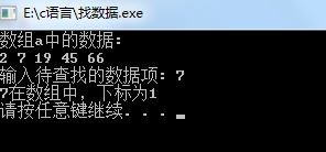 // 练习:使用二分查找,在一组有序元素中查找数据项 // 形参是数组,实参是数组名 #include <stdio.h> #include <stdlib.h> const int N=5; int binarySearch(int x[], int n, int item); // 函数声明 int main() { int a[N]={2,7,19,45,66}; int i,index, key; printf("数组a中的数据:\n"); for(i=0;i<N;i++) printf("%d ",a[i]); printf("\n"); printf("输入待查找的数据项: "); scanf("%d", &key); // 调用函数binarySearch()在数组a中查找指定数据项item,并返回查找结果给index index=binarySearch(a,N,key); // ××× if(index>=0) printf("%d在数组中,下标为%d\n", key, index); else printf("%d不在数组中\n", key); system("pause"); return 0; } //函数功能描述: //使用二分查找算法在数组x中查找特定值item,数组x大小为n // 如果找到,返回其下标 // 如果没找到,返回-1 int binarySearch(int x[], int n, int item) { int low, high, mid; low = 0; high = n-1; while(low<=high) { mid = (low+high)/2; if (item==x[mid]) return mid; else if(item<x[mid]) high=mid-1; else low=mid+1; } return -1; }