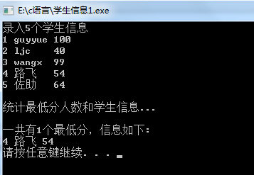#include <stdio.h> #include <stdlib.h> const int N=5; // 定义结构体类型struct student,并定义STU为其别名 typedef struct student { long no; char name[20]; int score; }STU; // 函数声明 void input(STU s[], int n); int findMinlist(STU s[], STU t[], int n); void output(STU s[], int n); int main() { STU stu[N], minlist[N]; int count; printf("录入%d个学生信息\n", N); input(stu, N); printf("\n统计最低分人数和学生信息...\n"); count = findMinlist(stu, minlist, N); printf("\n一共有%d个最低分,信息如下:\n", count); output(minlist, count); system("pause"); return 0; } // 输入n个学生信息,存放在结构体数组s中 void input(STU s[], int n) { int i; for(i=0; i<n; i++) scanf("%ld %s %d", &s[i].no, s[i].name, &s[i].score); } // 输出结构体s中n个元素信息 void output(STU s[], int n) { int i; for(i=0; i<n; i++) printf("%ld %s %d\n", s[i].no, s[i].name, s[i].score); } // 在结构体数组s中,查找最低分学生的记录,将其存入结构体数组s中 // 形参n是结构体数组s中元素个数 // 函数返回最低分的学生人数 int findMinlist(STU s[], STU t[], int n) { int i,j,k=0; STU temp; for(i=0;i<n;i++) for(j=0;j<n-i-1;j++) if(s[j].score>s[j+1].score) { temp=s[j]; s[j]=s[j+1]; s[j+1]=temp; } for(i=0;i<n;i++) if(s[i].score==s[j+1].score)//从小到大排序,如果最低分存在相同情况,将第二个和第一个比较并依次类推知道把相同的都计算一遍 t[k++]=s[i]; return k; }