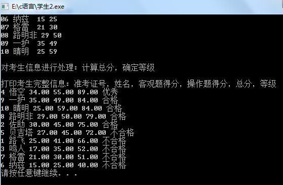#include <stdio.h> #include <stdlib.h> #include <string.h> const int N = 10; // 定义结构体类型struct student,并定义其别名为STU typedef struct student { long int id; char name[20]; float objective; /*客观题得分*/ float subjective; /*操作题得分*/ float sum; char level[10]; }STU; // 函数声明 void input(STU s[], int n); void output(STU s[], int n); void process(STU s[], int n); int main() { STU stu[N]; printf("录入%d个考生信息: 准考证号,姓名,客观题得分(<=40),操作题得分(<=60)\n", N); input(stu, N); printf("\n对考生信息进行处理: 计算总分,确定等级\n"); process(stu, N); printf("\n打印考生完整信息: 准考证号,姓名,客观题得分,操作题得分,总分,等级\n"); output(stu, N); system("pause"); return 0; } // 录入考生信息:准考证号,姓名,客观题得分,操作题得分 void input(STU s[], int n) { // 补足代码 // ××× int i; for(i=0;i<n;i++) scanf("%ld %s %f %f",&s[i].id, s[i].name, &s[i].objective, &s[i].subjective); } //输出考生完整信息: 准考证号,姓名,客观题得分,操作题得分,总分,等级 void output(STU s[], int n) { // 补足代码 // ××× int i; for(i=0;i<n;i++) printf("%ld %s %.2f %.2f %.2f %s\n",s[i].id, s[i].name, s[i].objective, s[i].subjective, s[i].sum, s[i].level); } // 对考生信息进行处理:计算总分,排序,确定等级 void process(STU s[], int n) { // 补足代码 // ××× int i,j; STU temp; for(i=0;i<n;i++) s[i].sum=s[i].objective+s[i].subjective; for(i=0;i<n-1;i++){ for(j=0;j<n-1-i;j++){ if(s[j].sum<s[j+1].sum){ temp=s[j]; s[j]=s[j+1]; s[j+1]=temp; } } } for(i=0;i<n;i++){ if(i<n*0.1) strcpy(s[i].level,"优秀"); else if(i>=n*0.1 && i<n*0.5) strcpy(s[i].level,"合格"); else strcpy(s[i].level,"不合格"); } }