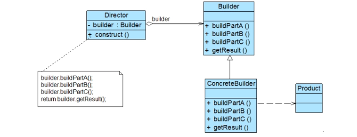 - Director(指挥者):指挥者又称为导演类,它负责安排复杂对象的建造次序,指挥者与抽象建造者之间存在关联关系,可以在其construct()建造方法中调用建造者对象的部件构造与装配方法,完成复杂对象的建造。客户端一般只需要与指挥者进行交互,在客户端确定具体建造者的类型,并实例化具体建造者对象(也可以通过配置文件和反射机制),然后通过指挥者类的构造函数或者Setter方法将该对象传入指挥者类中