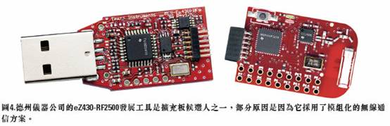 其中之一是德州儀器公司的 eZ430-RF2500 開發工具,它包括兩個 USB Sstick大小的開發板,支持彼此間的無線連接(圖 4)。