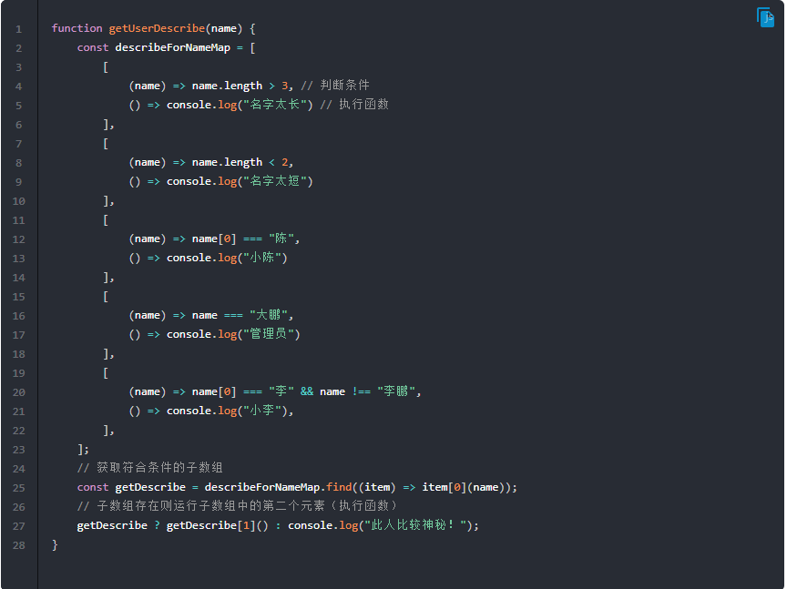 上面我们定义了一个describeForNameMap数组,数组内的每一个元素代表一个判断条件与其执行函数的集合(也是一个数组),之后我们通过数组的find方法查找describeForNameMap数组中符合判断条件的子数组即可。