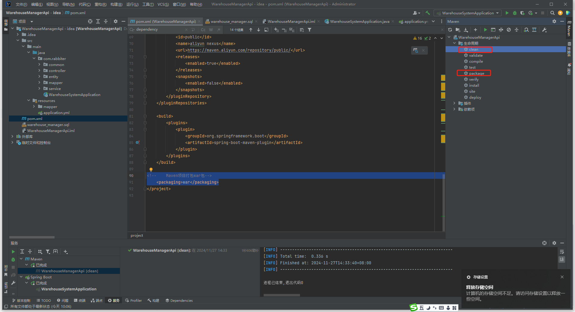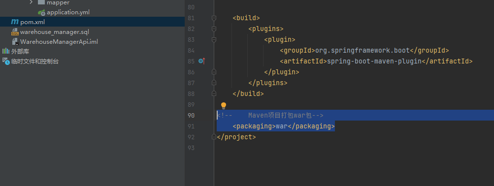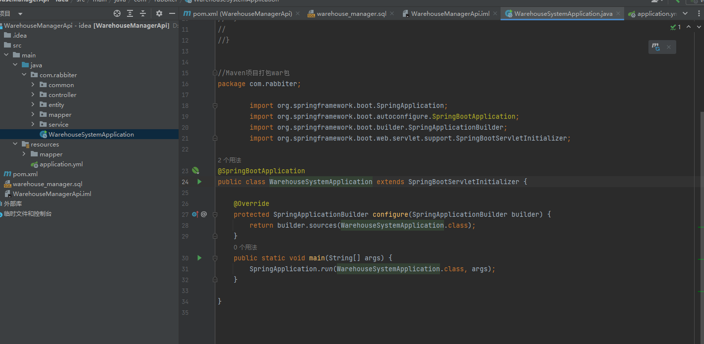 //Maven项目打包war包 package com.rabbiter; import org.springframework.boot.SpringApplication; import org.springframework.boot.autoconfigure.SpringBootApplication; import org.springframework.boot.builder.SpringApplicationBuilder; import org.springframework.boot.web.servlet.support.SpringBootServletInitializer; @SpringBootApplication public class WarehouseSystemApplication extends SpringBootServletInitializer { @Override protected SpringApplicationBuilder configure(SpringApplicationBuilder builder) { return builder.sources(WarehouseSystemApplication.class); } public static void main(String[] args) { SpringApplication.run(WarehouseSystemApplication.class, args); } }