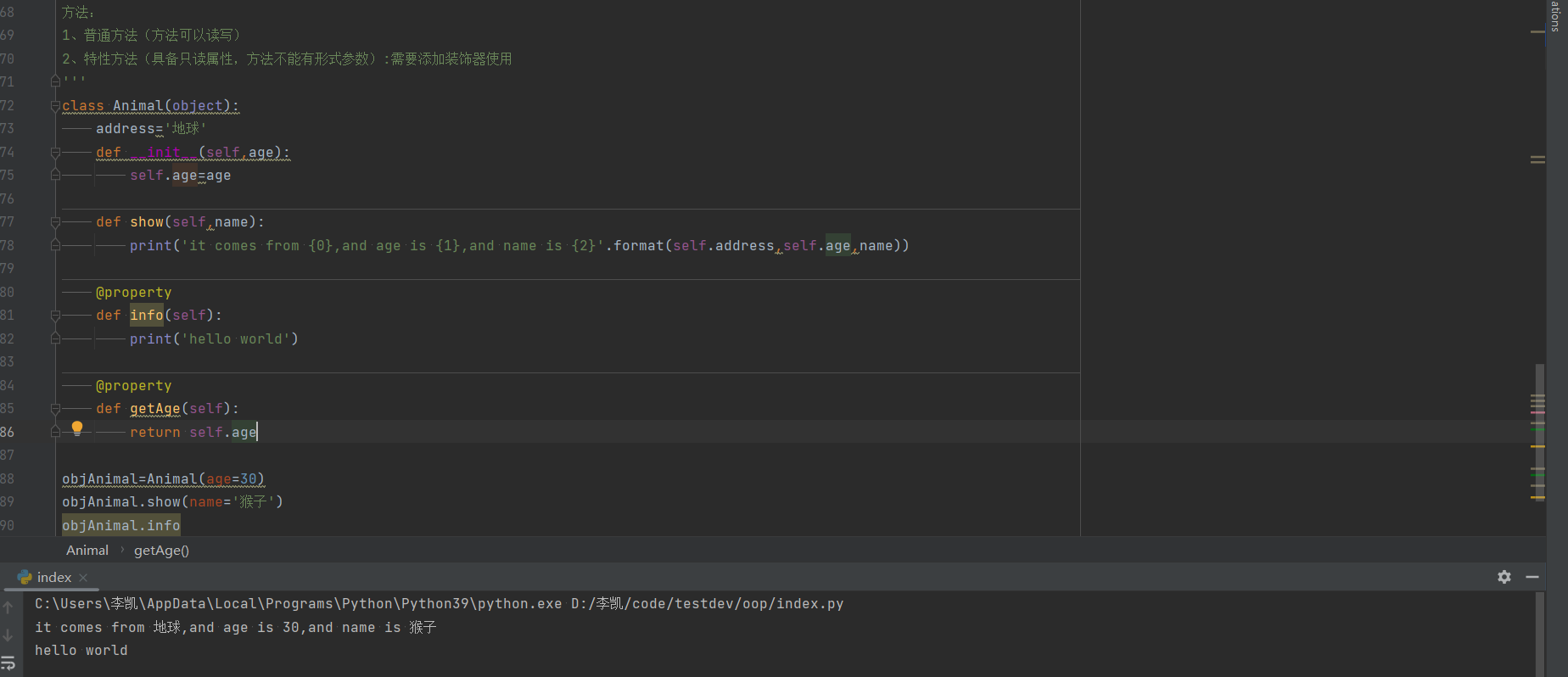 (3)特性方法,只具备只读属性,不能写(这个方法里面不能有形式参数),在装饰器(@property)下定义的方法。