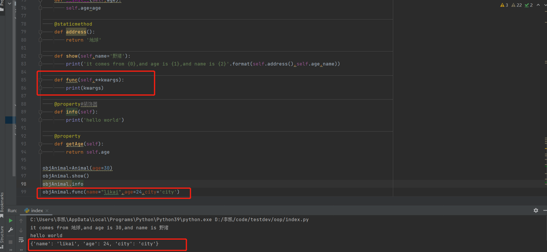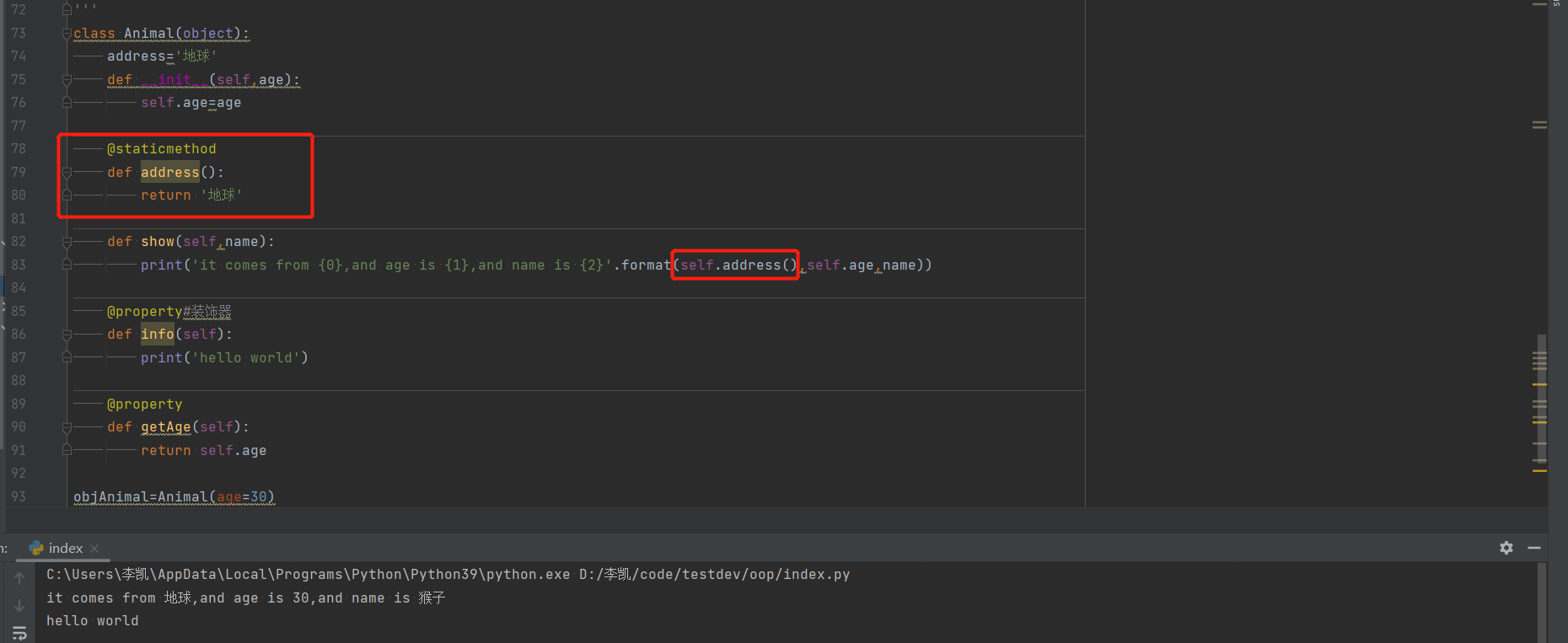 3、静态方法(属于类,只能使用类名来调用),一般把数据属性使用静态方法俩进行了处理,需要用到装饰器@staticmethod
