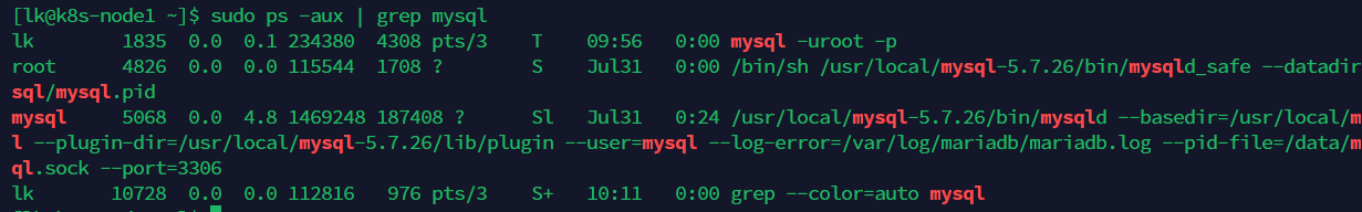 STAT:显示进程当前的状态,S(休眠)、R(运⾏)、Z(僵死)、<(⾼优先级)、N(低优先级)、s(⽗进程)、+ (前台进程);