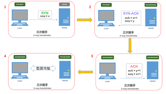 (1)首先客户端向服务器端发送一段TCP报文,其中:标记位为SYN,表示“请求建立新连接”;序号为Seq=X(X一般为1);随后客户端进入SYN-SENT阶段。