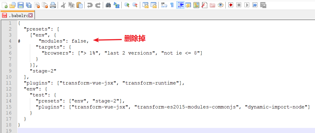 其中{ "modules": false }阻止了babel进行模块转换,所以,将modules改为默认设置即可,或者删除该配置。