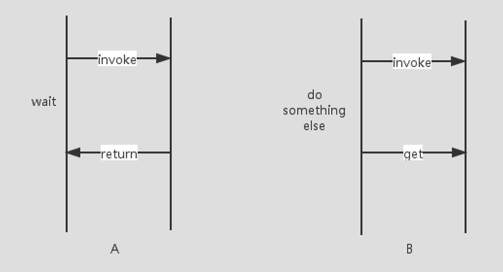 上图简单描述了不使用Future和使用Future的区别,不使用Future模式,主线程在invoke完一些耗时逻辑之后需要等待,这个耗时逻辑在实际应用中可能是一次RPC调用,可能是一个本地IO操作等。B图表达的是使用Future模式之后,我们主线程在invoke之后可以立即返回,去做其他的事情,回头再来看看刚才提交的invoke有没有结果。