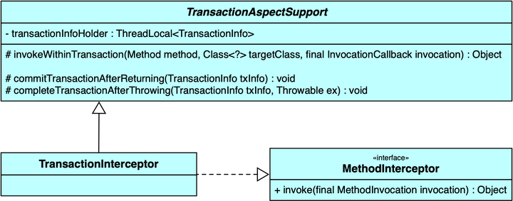 声明式事务的实现就是通过环绕增强的方式,在目标方法执行之前开启事务,在目标方法执行之后提交或者回滚事务,事务拦截器的继承关系图可以体现这一点: