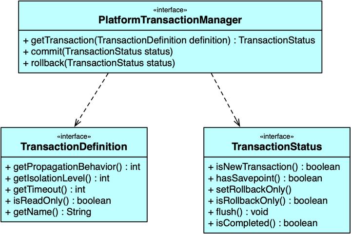 PlatformTransactionManager:事务管理器getTransaction方法:事务获取操作,根据事务属性定义,获取当前事务或者创建新事物;commit方法:事务提交操作,注意这里所说的提交并非直接提交事务,而是根据当前事务状态执行提交或者回滚操作;rollback方法:事务回滚操作,同样,也并非一定直接回滚事务,也有可能只是标记事务为只读,等待其他调用方执行回滚。TransactionDefinition:事务属性定义getPropagationBehavior方法:返回事务的传播属性,默认是PROPAGATION_REQUIRED;getIsolationLevel方法:返回事务隔离级别,事务隔离级别只有在创建新事务时才有效,也就是说只对应传播属性PROPAGATION_REQUIRED和PROPAGATION_REQUIRES_NEW;getTimeout方法:返回事务超时时间,以秒为单位,同样只有在创建新事务时才有效;isReadOnly方法:是否优化为只读事务,支持这项属性的事务管理器会将事务标记为只读,只读事务不允许有写操作,不支持只读属性的事务管理器需要忽略这项设置,这一点跟其他事务属性定义不同,针对其他不支持的属性设置,事务管理器应该抛出异常。getName方法:返回事务名称,声明式事务中默认值为“类的完全限定名.方法名”。TransactionStatus:当前事务状态isNewTransaction方法:当前方法是否创建了新事务(区别于使用现有事务以及没有事务);hasSavepoint方法:在嵌套事务场景中,判断当前事务是否包含保存点;setRollbackOnly和isRollbackOnly方法:只读属性设置(主要用于标记事务,等待回滚)和查询;flush方法:刷新底层会话中的修改到数据库,一般用于刷新如Hibernate/JPA的会话,是否生效由具体事务资源实现决定;isCompleted方法:判断当前事务是否已完成(已提交或者已回滚)。