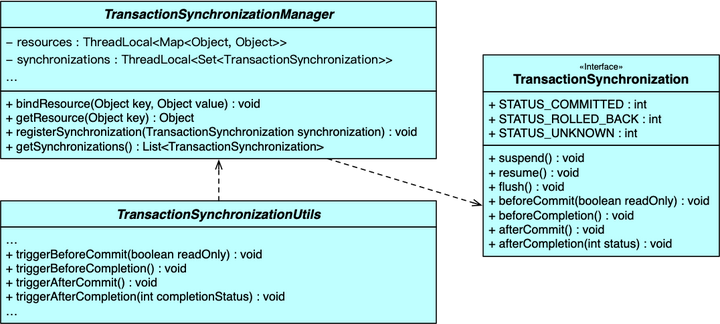 TransactionSynchronizationManager通过ThreadLocal对象在当前线程记录了resources和synchronizations属性。resources是一个HashMap,用于记录当前参与事务的事务资源,方便进行事务同步,在DataSourceTransactionManager的例子中就是以dataSource作为key,保存了数据库连接,这样在同一个线程中,不同的方法调用就可以通过dataSource获取相同的数据库连接,从而保证所有操作在一个事务中进行。synchronizations属性是一个TransactionSynchronization对象的集合,AbstractPlatformTransactionManager类中定义了事务操作各个阶段的调用流程,以事务提交为例: