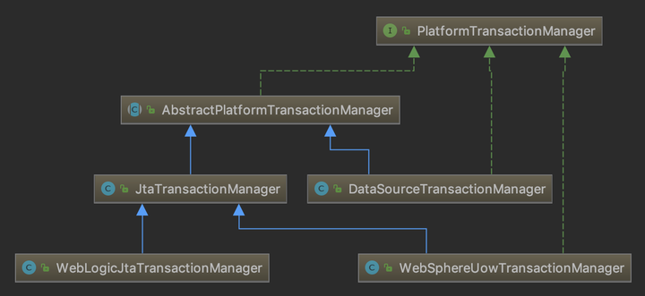 AbstractPlatformTransactionManager抽象类实现了Spring事务的标准流程,其子类DataSourceTransactionManager是我们使用较多的JDBC单数据源事务管理器,而JtaTransactionManager是JTA(Java Transaction API)规范的实现类,另外两个则分别是JavaEE容器WebLogic和WebSphere的JTA事务管理器的具体实现。