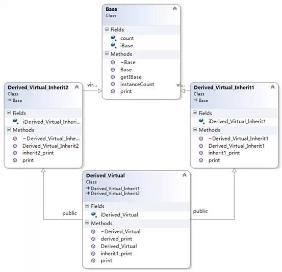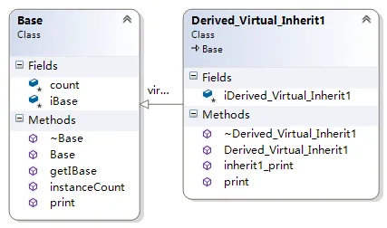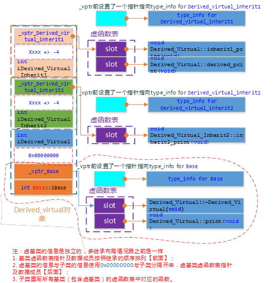 因为Base中包含虚函数表指针,所有size为4;Derived继承Base,只是扩充基类的虚函数表,不会新增虚函数表指针,所以size也是4;Derived_Virtual虚继承Base,根据前面的模型知道,派生类有自己的虚函数表及指针,并且有分隔符(0x00000000),然后才是虚基类的虚函数表等信息,故大小为4+4+4=12。