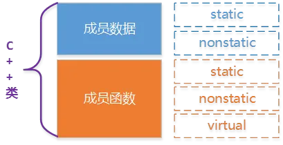 概括来说,在C++类中有两种成员数据:static、nonstatic;三种成员函数:static、nonstatic、virtual。