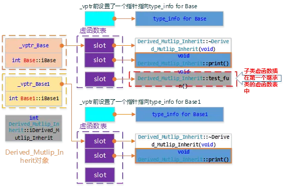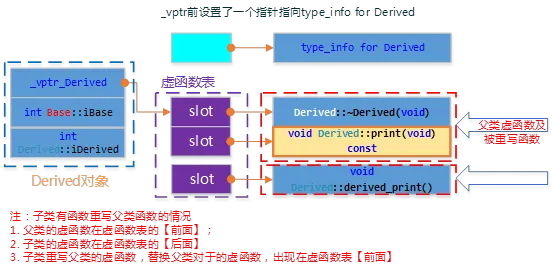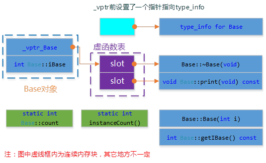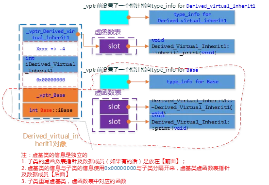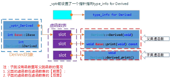 另外,虚函数表地址的前面设置了一个指向type_info的指针,RTTI(Run Time Type Identification)运行时类型识别是有编译器在编译器生成的特殊类型信息,包括对象继承关系,对象本身的描述,RTTI是为多态而生成的信息,所以只有具有虚函数的对象在会生成。