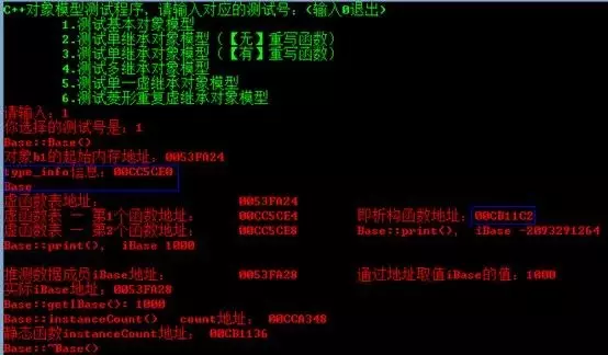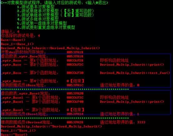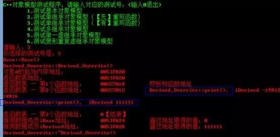 注意:本测试代码及后面的测试代码中写的函数地址,是对应虚函数表项的地址,不是实际的函数地址。