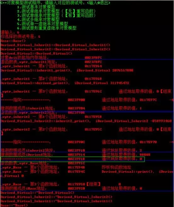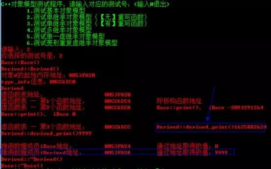 cout << "推测数据成员iDerived地址:\t" << ((int*)(&dvi1) +6) << "\t通过地址取得的值:" << *((int*)(&dvi1) +6) << endl;