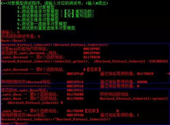 cout << "推测数据成员iInherit2地址:\t" << ((int*)(&dvi1) +5) << "\t通过地址取得的值:" << *((int*)(&dvi1) +5) << endl;