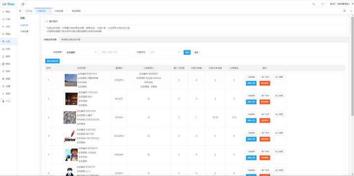 分销会员列表可以看到所有的分销会员信息、推广下级分销会员信息,并且对分销会员信息进行审核以及“增删改查等等”。
