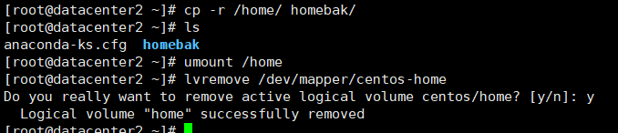 5. 删除/home所在的lv : lvremove /dev/mapper/centos-home