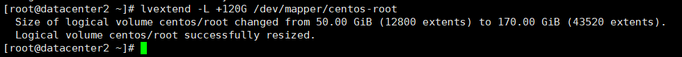 6. 扩展/root 所在的lv,增加120G : lvextend -L +120G /dev/mapper/centos-root