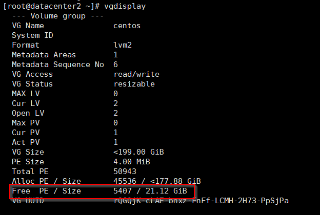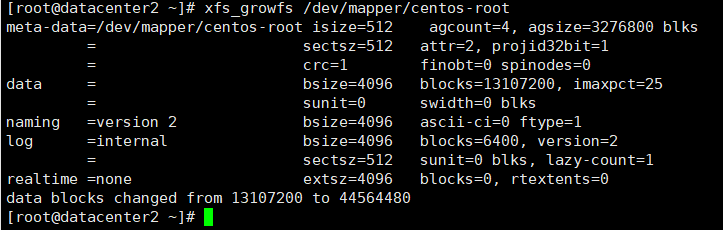 7. 扩展 /root 文件系统 : xfs_growfs /dev/mapper/centos-root