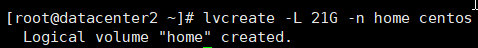 9. 重新创建 home lv : lvcreate -L 21G -n home centos